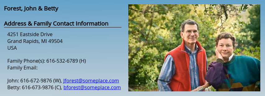 The main feature that all users can see is the online and downloadable directories, either with or without photos. The downloadable directories may be password protected to keep your directory secure. A typical entry in the photo directory is shown to the right. The default directory picture height is 1.4 inches.
